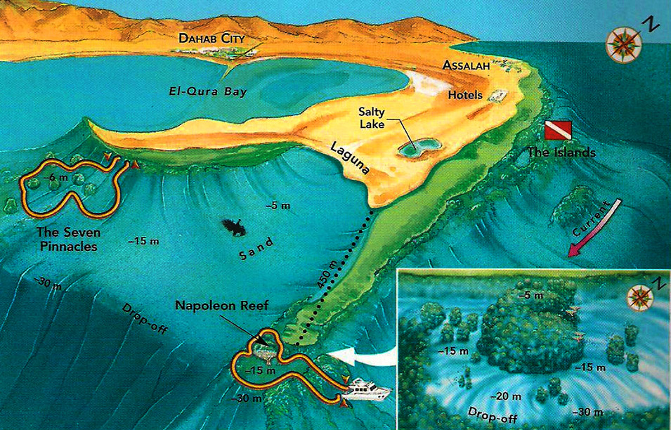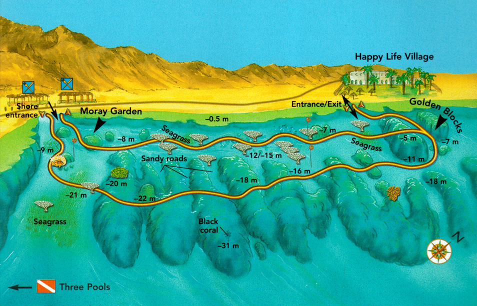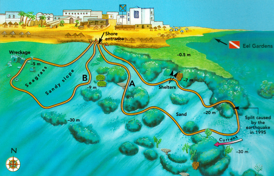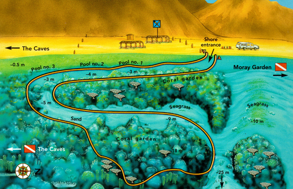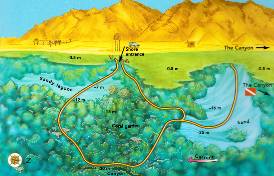 A very pretty dive with an easy beach entry in front of a Bedouin restaurant, you start the dive swimming through 3 shallow (3m) sandy lagoons and exiting into the sea where a sandy slope meets a beautiful hard coral reef dropping slowly to 30+ meters. Heading North over an extensive coral reef or along the edge of a drop off at 19m you will encounter many reef fish and maybe Napoleon Wrasse, Morays and Rays. Returning at around 10m over some superb corals with Giant Pufferfish and barracuda then exiting back through the lagoons.