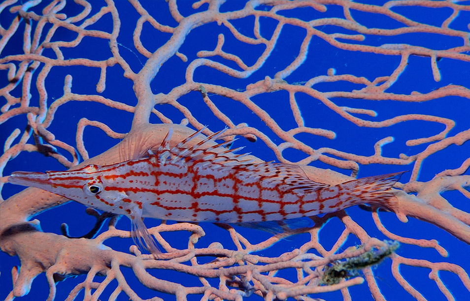 Just a little further south and nestling at the foot of the mountains Umm Sid also offers a splendid dive for all levels. Entry is also from a small beach then following a sandy slope down where you can find many Garden Eels. Continuing down to 30m you come across a magnificent Gorgonian Fan coral. From there you start heading up a slope with many sizable table corals, giving shelter to Groupers and other reef fish, and then rejoin the reef at around 12m and head south over the corals towards the exit. There is a large pinnacle conveniently situated for the safety stop, look out for the Giant Moray!